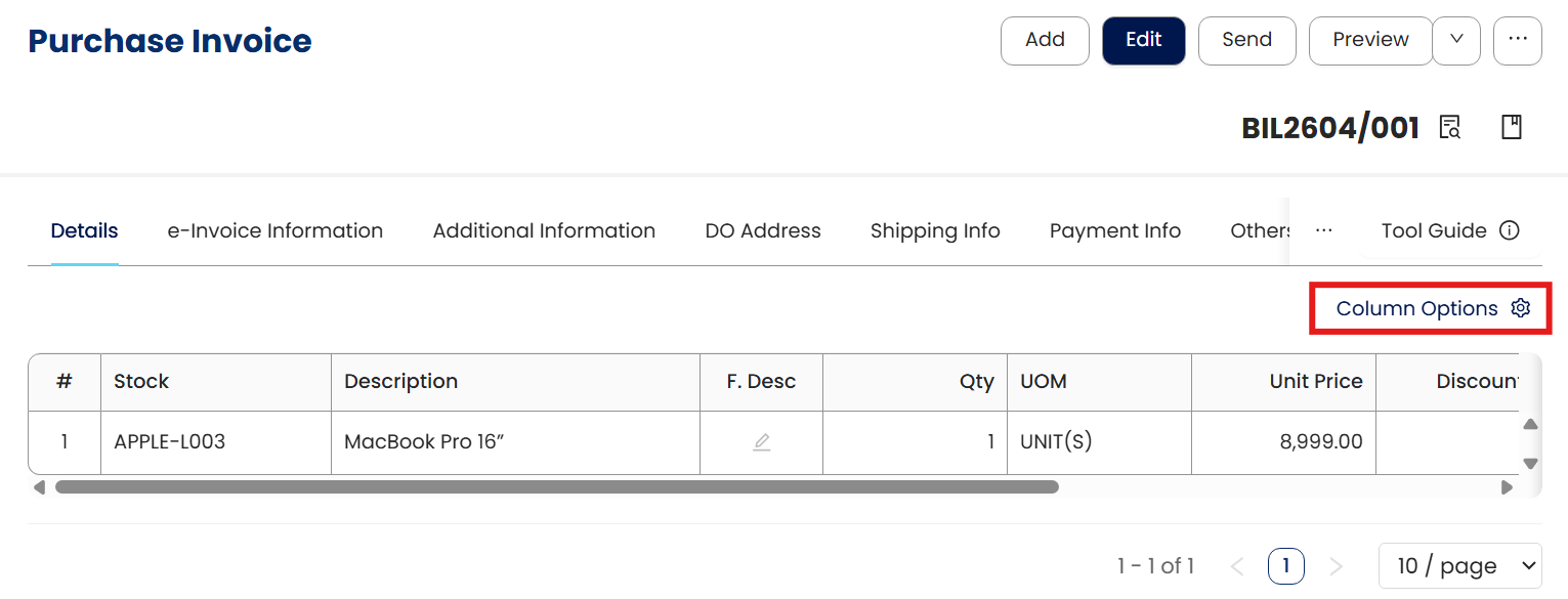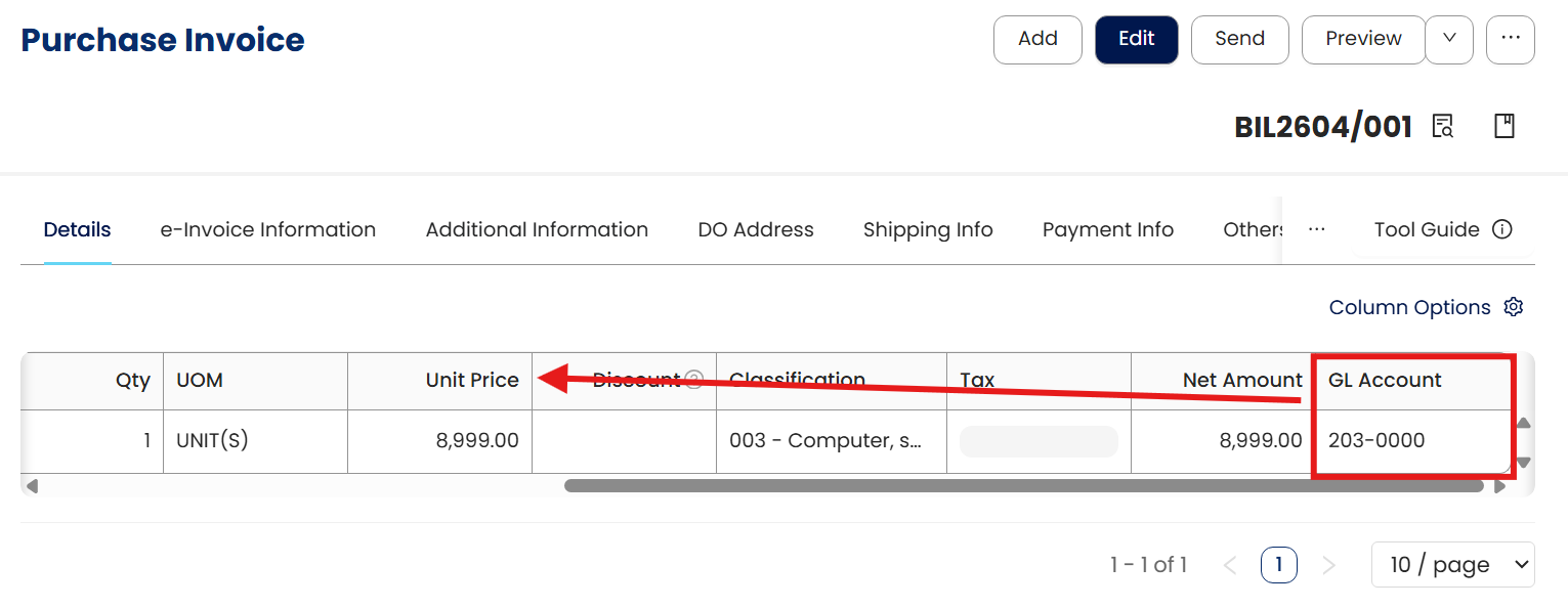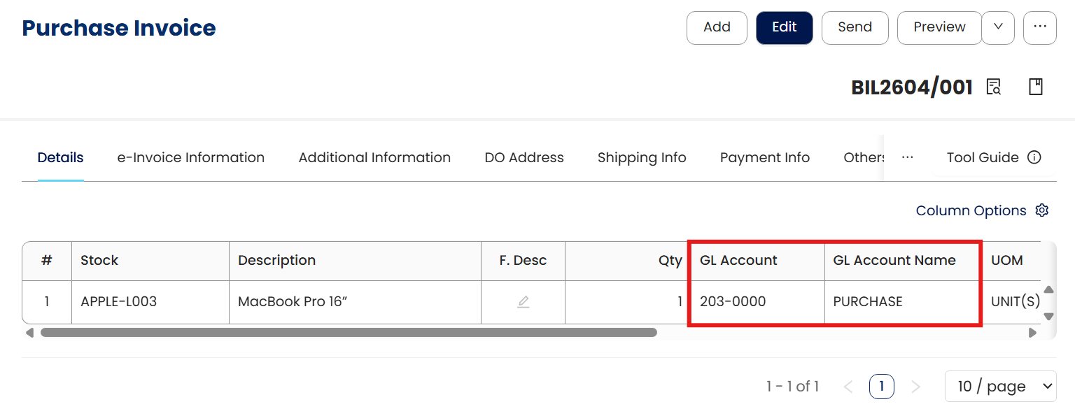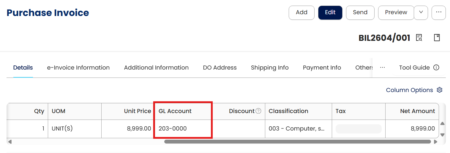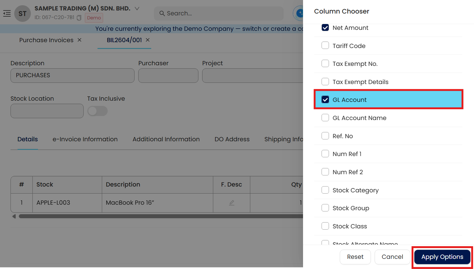 Select the transaction you would like to display GL Account codes. Example, Purchase Invoice Click on ‘Column Options’