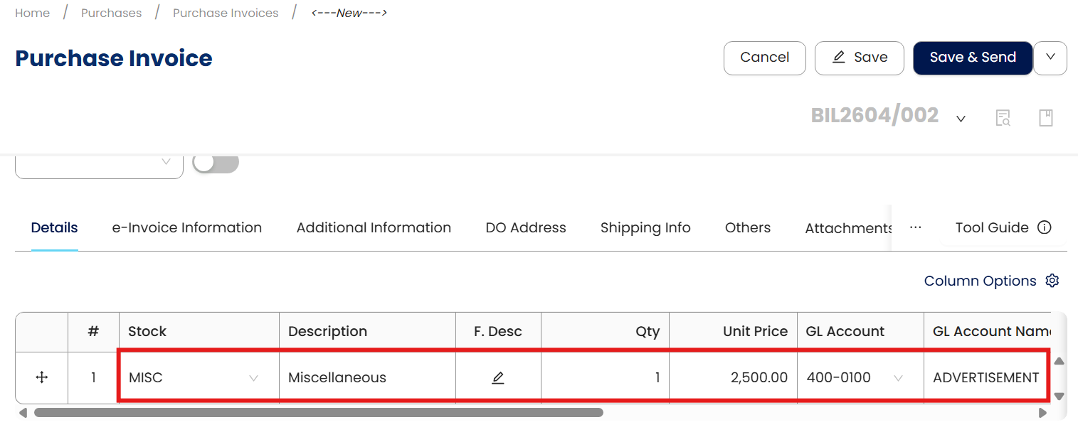 In the transaction, select MISC as the stock code, update the description, choose the correct GL account, enter the amount, and change the classification if required.