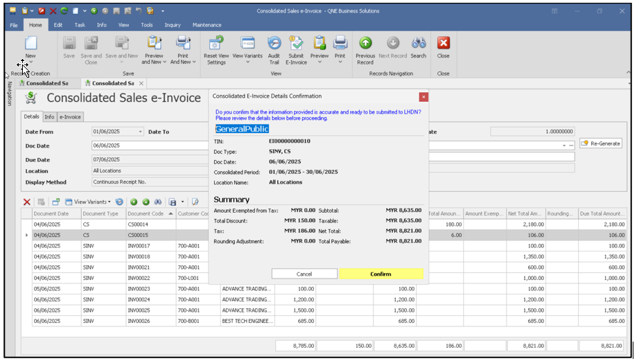 6. After generate Consolidated e-Invoice, preview the report, it will display document separately