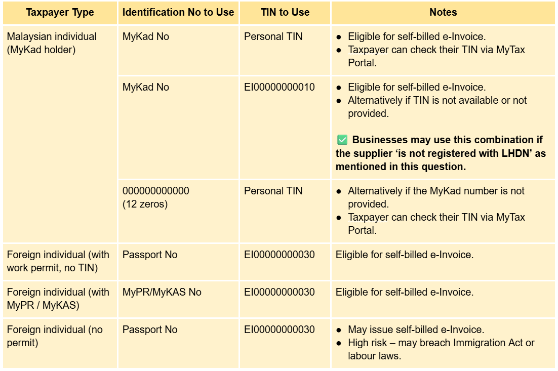 If YES → You may issue a self-billed e-Invoice using the correct combination of identification number and TIN based on the taxpayer’s status: