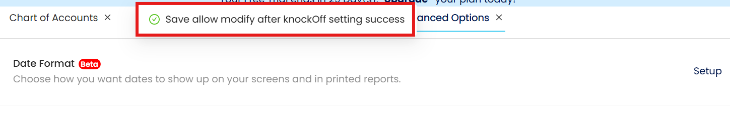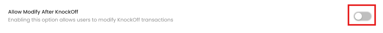 A finance staff discovers that a receipt applied to an invoice was recorded with an incorrect reference number. Since the transaction has already been knocked off, editing is normally restricted. By enabling the Allow Modify After KnockOff feature, they can make the necessary correction without reversing the applied transaction.
