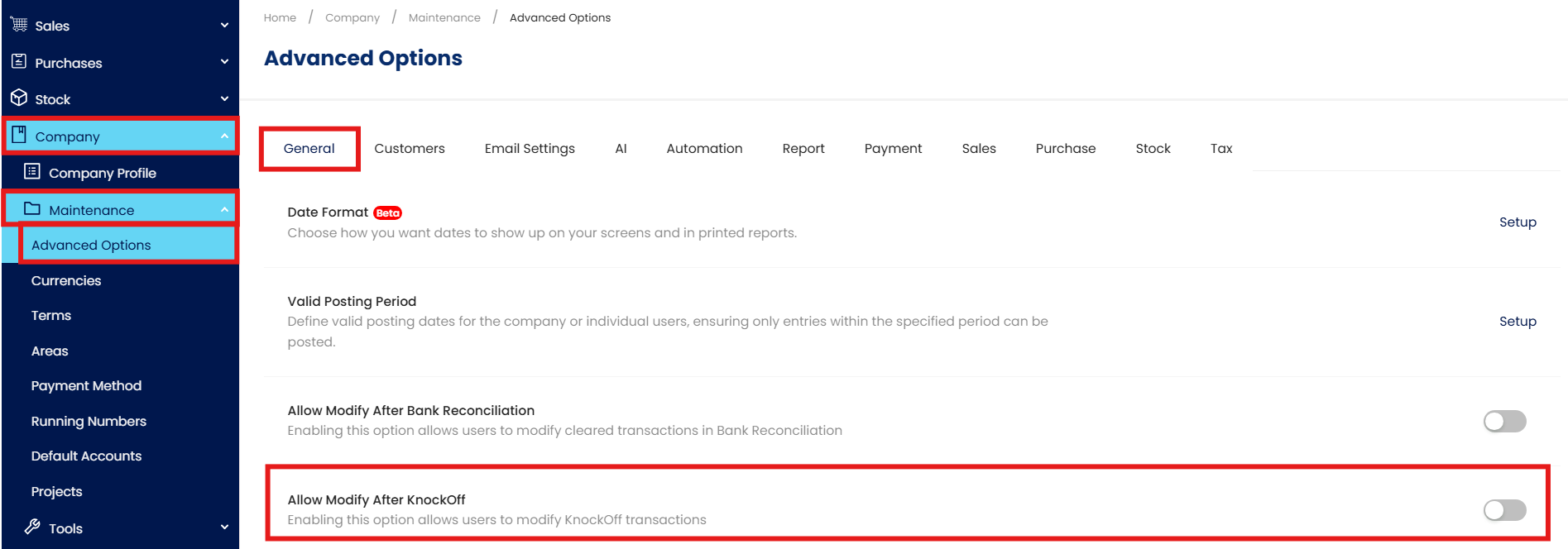 Go to Company > Maintenance > Advanced Options > General