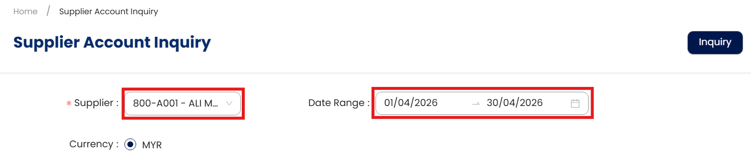 In the Supplier field, select the supplier whose account you want to review and set the Date Range.