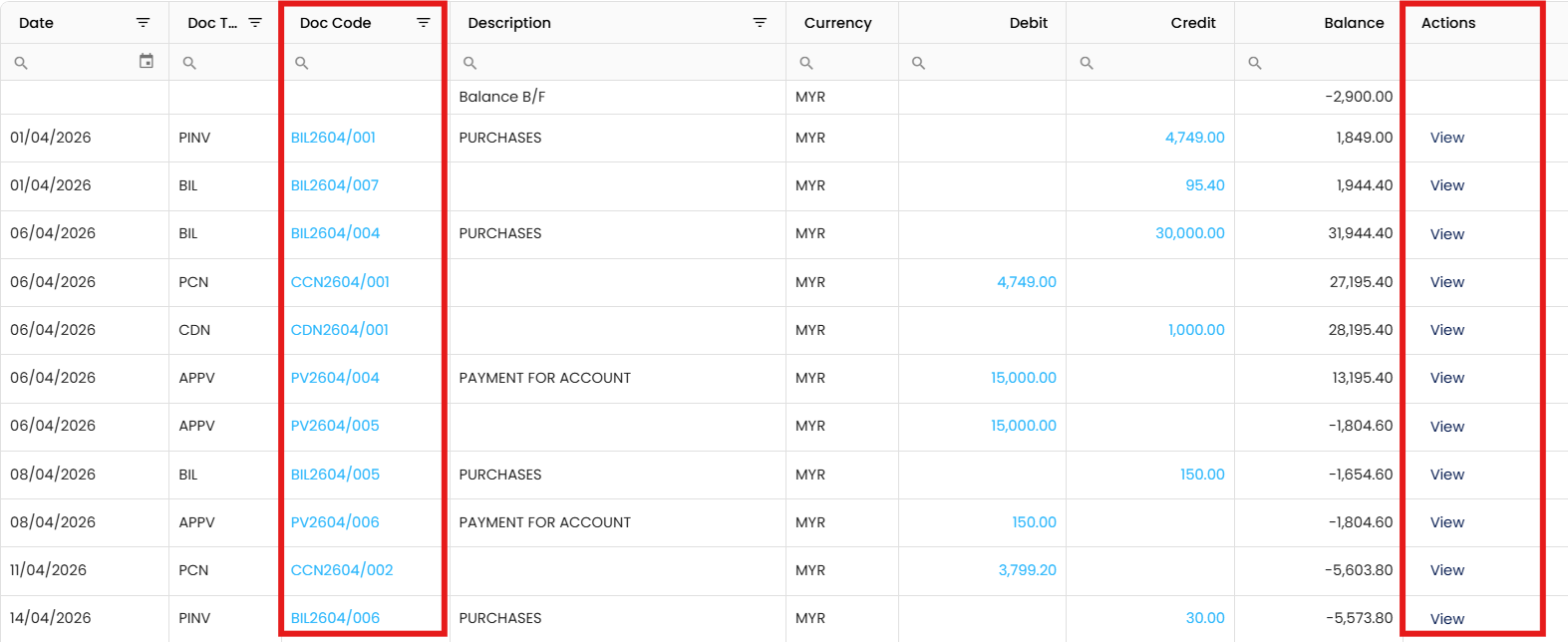 Note: You can click on the Document Code or the View link in the Action column to open the source document and view full transaction details.
