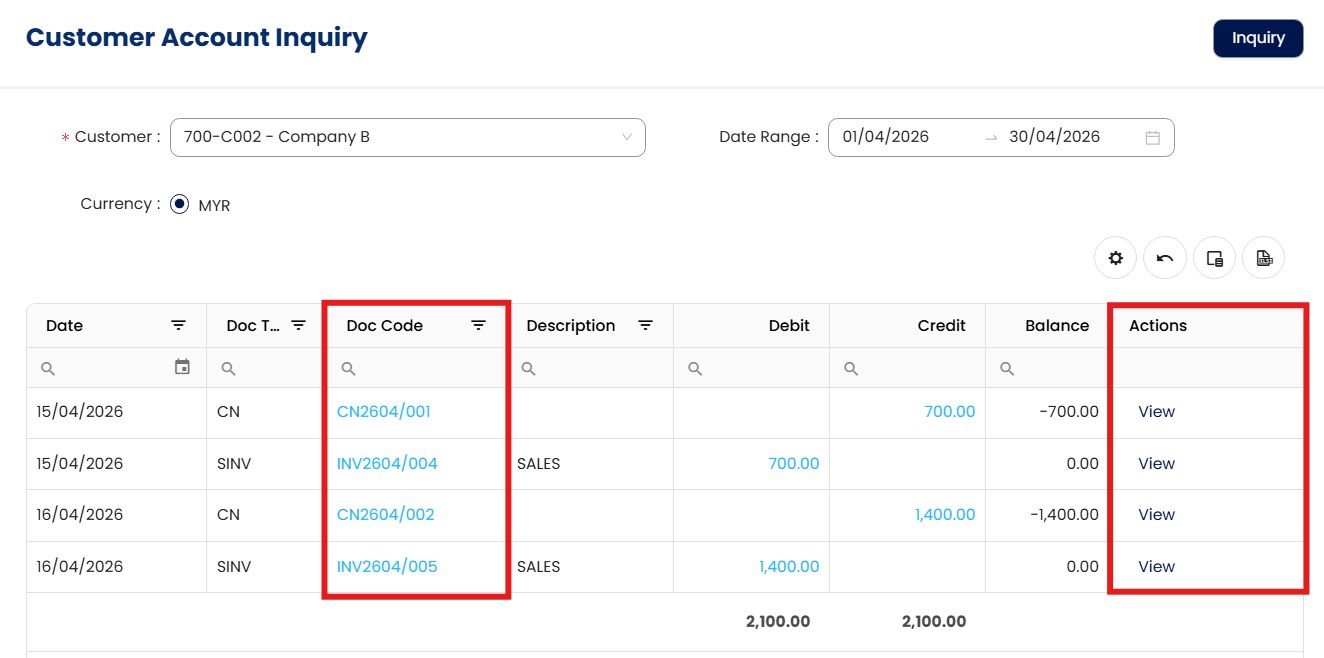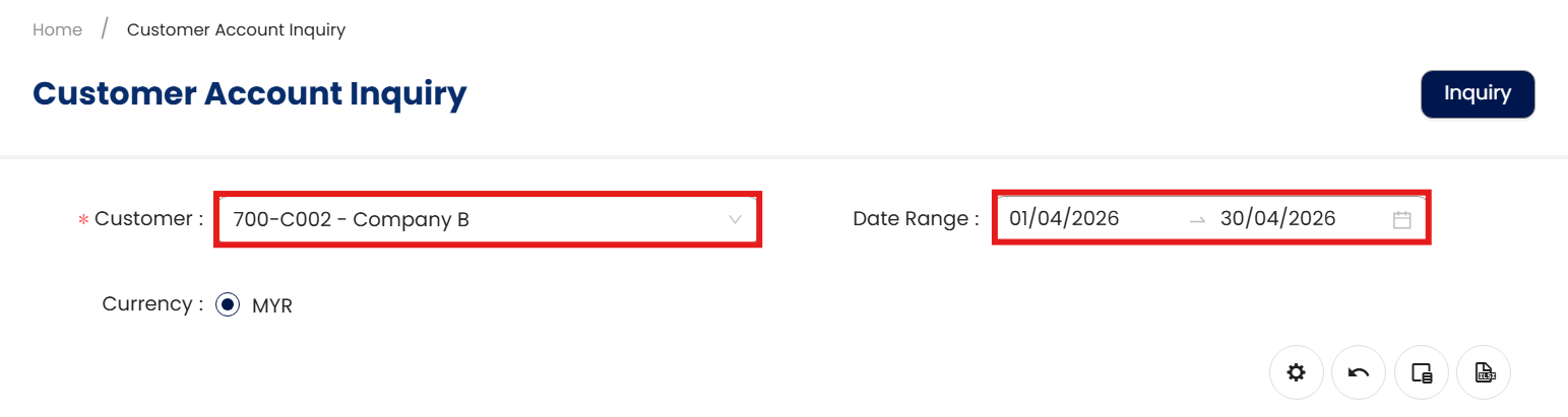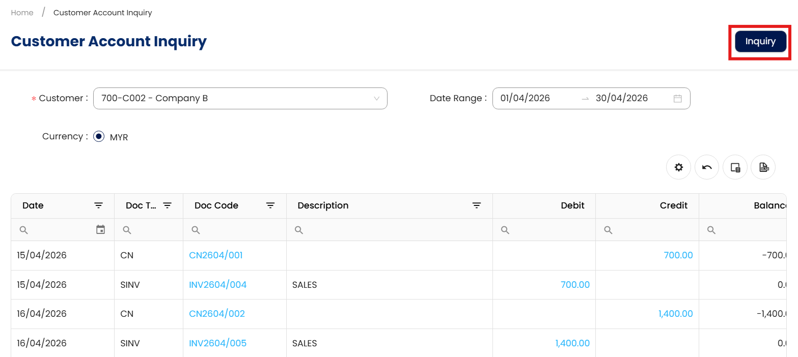 A collections officer needs to follow up on unpaid invoices for a specific customer. Rather than navigating through multiple modules or exporting a full aging report, the officer uses the Customer Inquiry feature to pull up all transactions—sales, payments, credit notes, and outstanding balances—for that customer within the current quarter.
