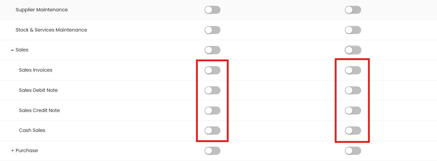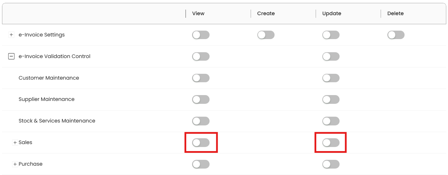 To ensure that the Sales staff do not have the permission to modify/change the Validation Control of the sales transactions as they prefer, users may disable the View & Update access of the Sales Module.