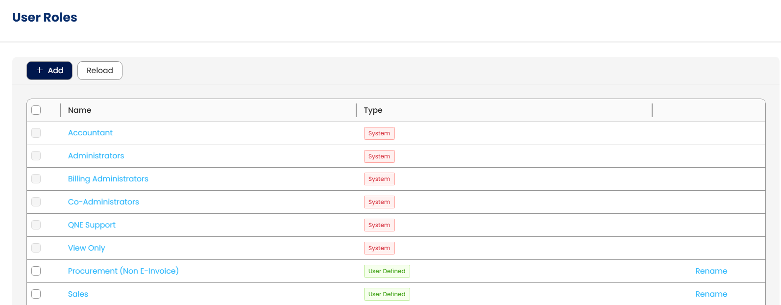 The screen showing should be the list of User Roles and the User Role creation platform. In the list, there are two (2) types of definition: System and User Defined. You can only adjust the role for User Defined type ONLY. System types are for VIEW only. To add a new user role, click on Add