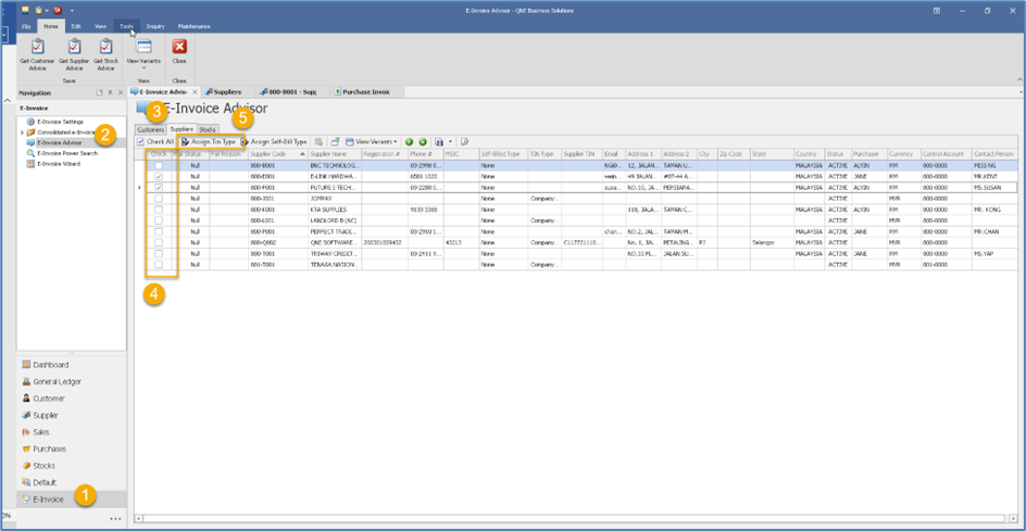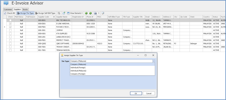 1. E-invoice > e-Invoice Advisor > Suppliers. Select the suppliers to be updated > then click ‘Assign TIN Type’