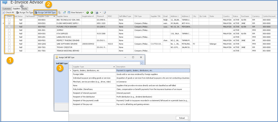 User can select multiples Suppliers to update the ‘Self-Billed Type’ and ‘TIN Type’ in e-Invoice Advisor or in the Supplier Maintenance List view