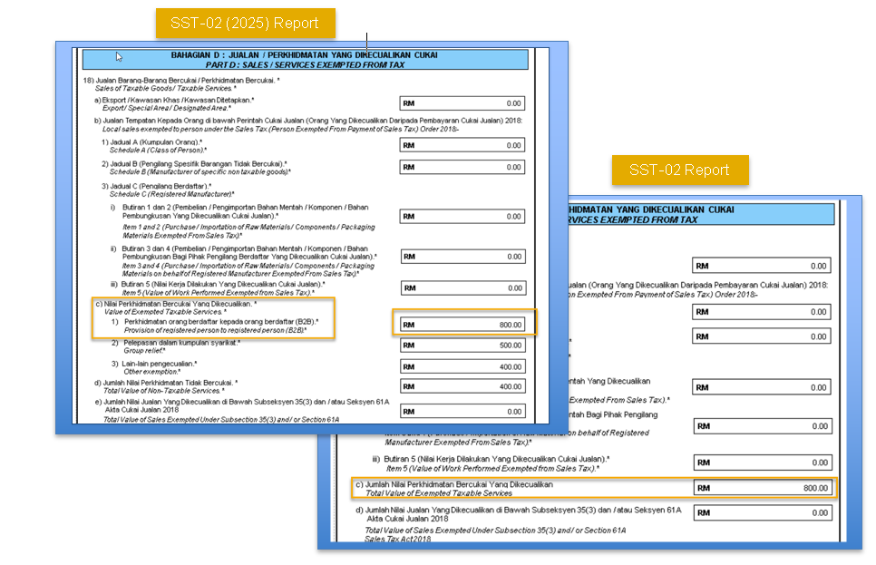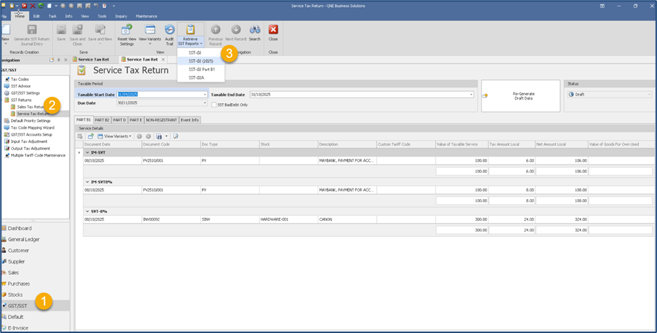 When users apply the new SST tax codes — SVTE-GR, SVTE-OTH, SVT-NTS, and IM-SVT8% — in their transactions, the system will automatically include these amounts in the relevant sections of the SST-02 Form (September 2025 onwards).