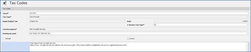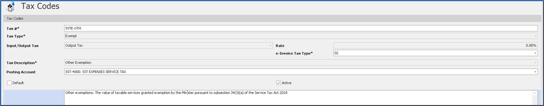 2. In Tax Codes maintenance, for the existing tax code SVTE is remain in the system additional description is added for better understanding about this tax code. Previously this tax code appeared in SST 02 form Part D item 18(c). And now, it appeared in SST 02 (2025) form Part D item 18(c)-1