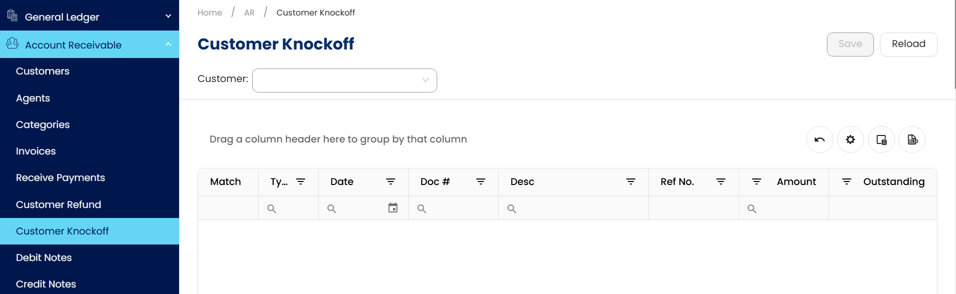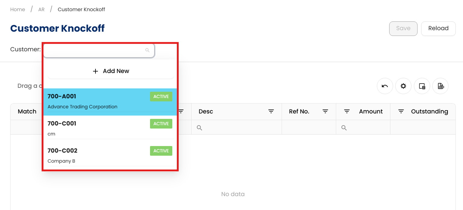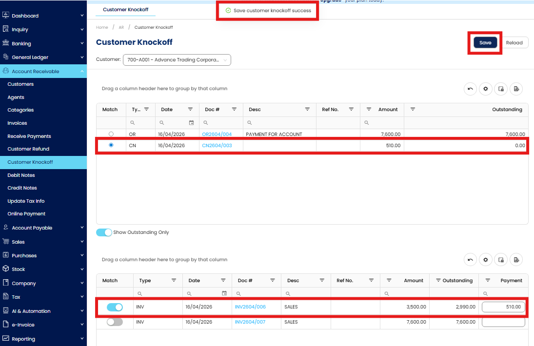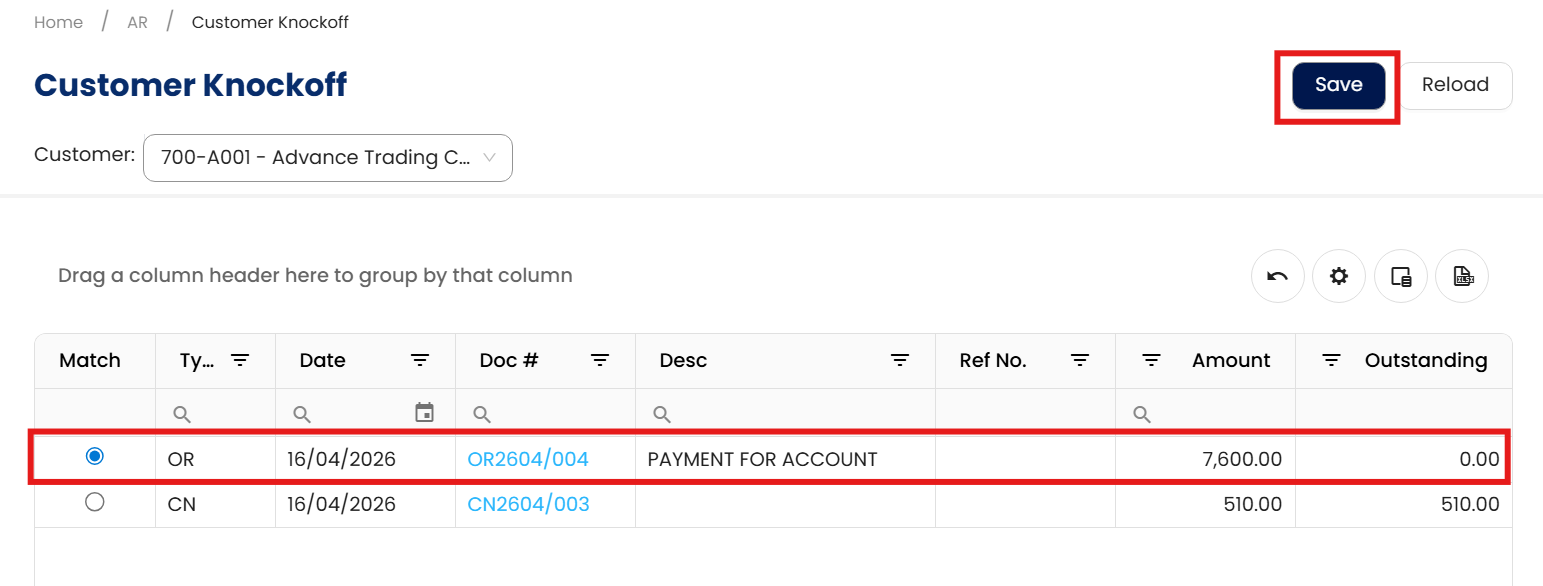 After you’ve done with the knock off, please ensure to reload the customer knock off to get the updated document list.